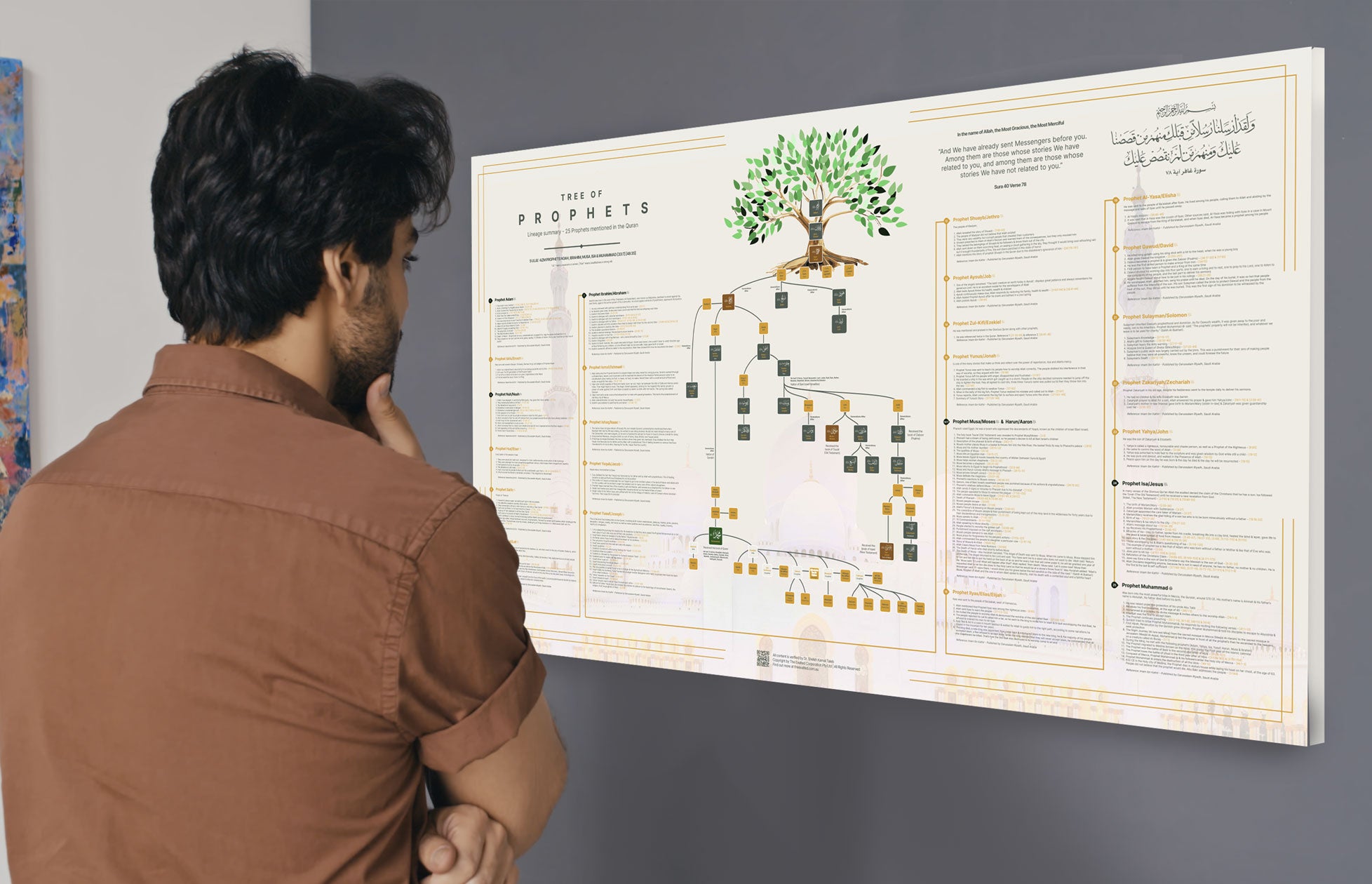 The Tree of Prophets is now a comprehensive lineage chart that covers all 25 Prophets mentioned in the Quran, from Prophet Adam to Prophet Muhammadصلى الله عليه وسلمﷺ. It describes the story of each Prophet and their chronological order of lineage. The Tree of Prophets artwork showcases over 1,000 Quranic verses related to each of the 25 Prophets mentioned in the Quran.
